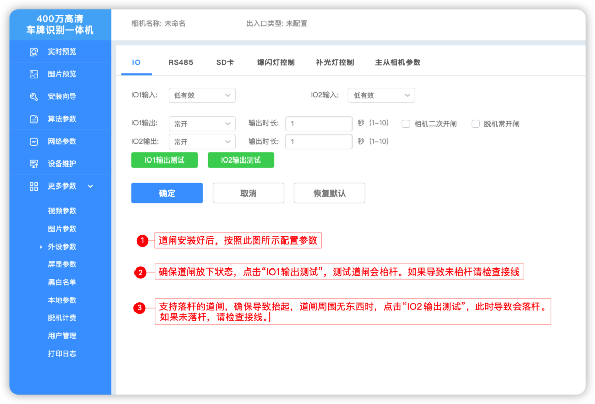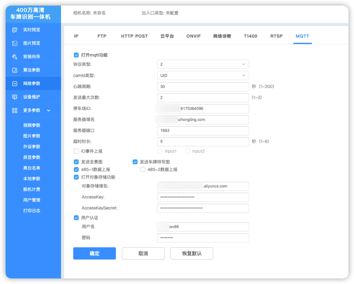 协议类型2CamId类型UID心跳周期30发送最大次数2停车场ID1883445587659247616服务器域名iot.yunzhongting.com服务器端口1883超时时长5对象存储域名yt-device.oss-cn-beijing.aliyuncs.comAccessKeyLTAI5t6uZQdaj1hvdt1RnTV6AccessKeySecretJQTg4qgvXuVXLzGMMMfTwQsQzVkRh2用户名huaxiapro密码5849DdutPy其余方框勾选如图所示 4. 道闸配置和测试