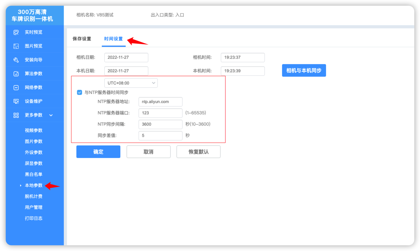 如图红框部分请按图设置,NTP服务器地址为“ntp.aliyun.com”,请注意区分符号。填入完成后点击“确定”,此时观察相机日期和时间,