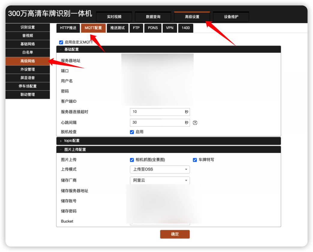 3. 输入MQTT服务器配置项 服务器地址iot.yunzhongting.com端口1883用户名zhenshir3pro密码Khgf51eGGC客户端ID确保客户端ID为设备ID服务器连接超时10秒心跳间隔30秒 4. 输入图片上传配置项 图片上传勾选:相机抓图(全景图)、车牌特写上传模式上传至OSS储存厂商阿里云储存服务器地址oss-cn-beijing.aliyuncs.com储存账号LTAI5tAvV4vw96ZFLnFyn9uz储存密码HiQxUPu8HyZxTvTvq35AepdV3NuIuYBucketyt-device 5. 获取设备序列号,配置到云中停平台