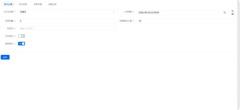 创建专属月卡类型(如果计费规则等模式与正常月租车一致,也可直接用正常月租车月卡)-月卡办理-开启自助绑车,录入车主信息电话号码(门店管理人员手机号)等,并设定车位容量与绑定上限。
